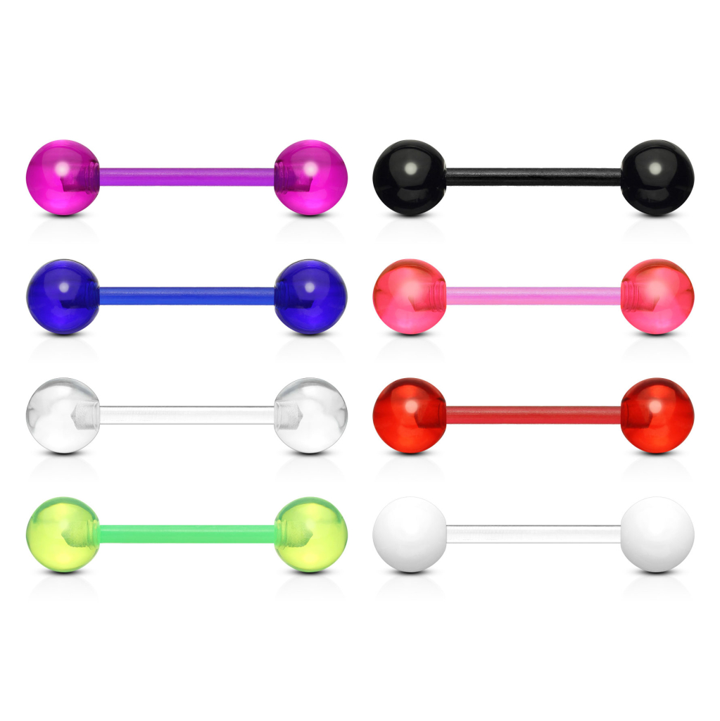 Por fin puedes aprovechar una oferta por la que te llevas 8 bonitas joyas para la lengua en distintos colores en la misma compra. Estas joyas están hechas de teflón, el cual es un material blando y muy cómodo de usar en tu piercing en la lengua. Las bolas están hechas de acrílico, que protegerá tus dientes y encías de cualquier golpe. Tanto el teflón como el acrílico son 100% libres de níquel, por lo que puedes estar tranquilo/a: esta joya es totalmente segura.