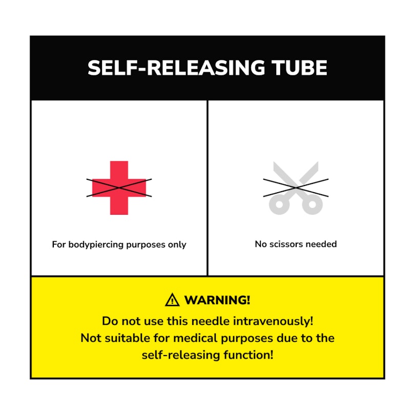 Son muy afiladas y están esterilizadas con gas OE. La caja incluye 50 agujas esterilizadas de forma individual, y cada aguja está equipada con un catéter. Lo más práctico y avanzado de este modelo de aguja es que no tendrás que usar tijeras para cortar el catéter. La aguja viene equipada con una función autoretráctil, lo que significa que la parte colorida del catéter se suelta por sí sola al retirar la aguja después de perforar. De esta forma, solo queda el catéter en el cuerpo, listo para que coloques la joya en el piercing.