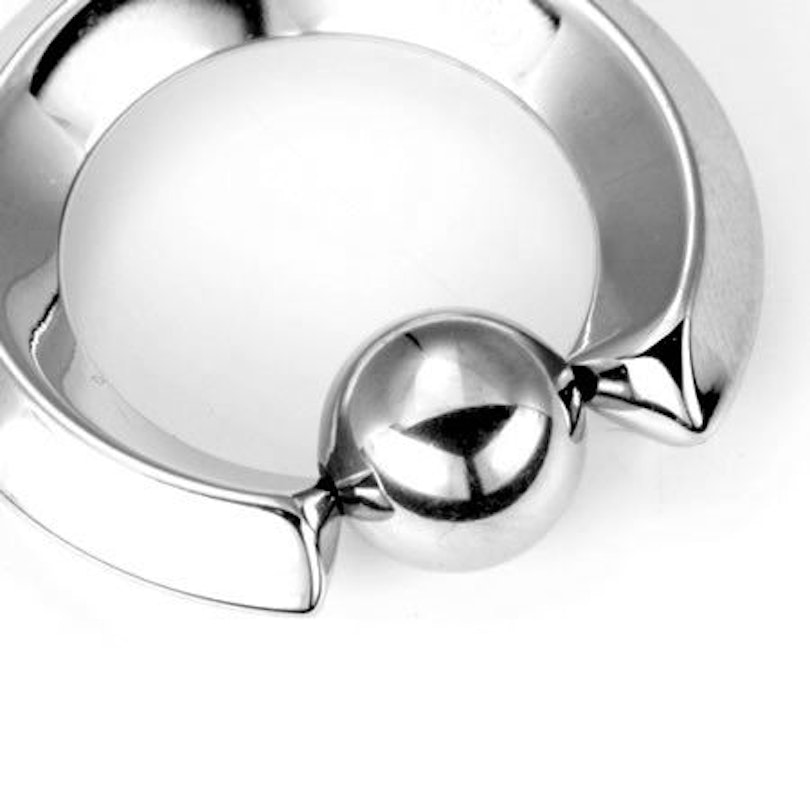 Esta argolla está disponible en varios tamaños, de los que el menor mide aproximadamente 2 mm y el mayor 8 mm. El material utilizado es el acero quirúrgico, el cual es muy duro y duradero. De hecho es tan duro que te recomendamos encarecidamente que consigas un abridor de aros, si todavía no tienes uno. Incluso para el modelo más pequeño de 2 mm puede ser muy difícil sacar la bola con las manos. O quizás es que en la tienda tenemos muy poquita fuerza :)