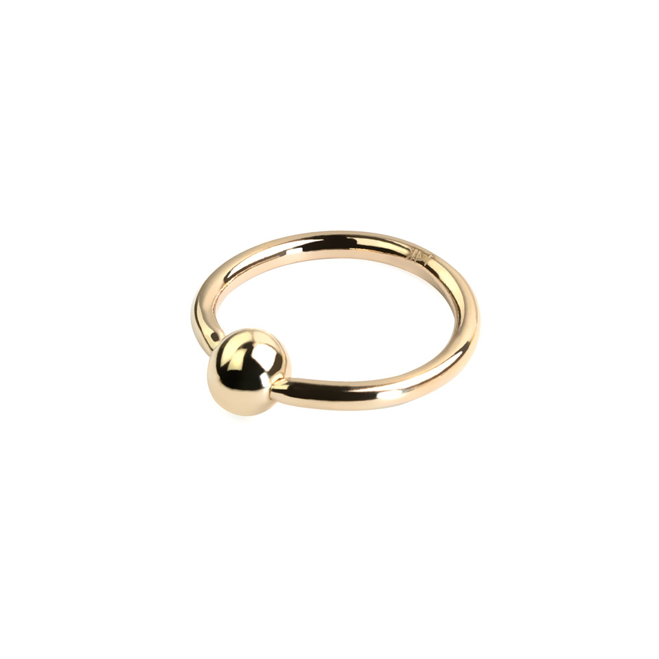 Bonito y simple aro con un diseño clásico, pero de oro de 14 quilates en vez de otros materiales que a menudo se utilizan para la joyería para piercings. Los aros cautivos son opciones muy populares por el hecho de que su diseño no necesita roscas, mientras que otras joyas que sí que las llevan pueden almacenar bacterias. En esta joya, la bola se encaja entre los dos extremos del aro, en dos hendiduras que tiene la bola, y que garantiza un cierre muy seguro.