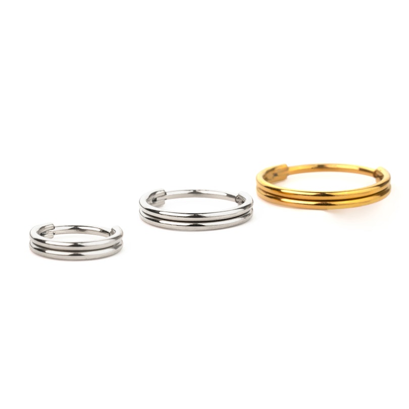 Este aro con bisagra te permite lucir el look de dos aros paralelos, aunque solo uno atraviesa tu piercing.