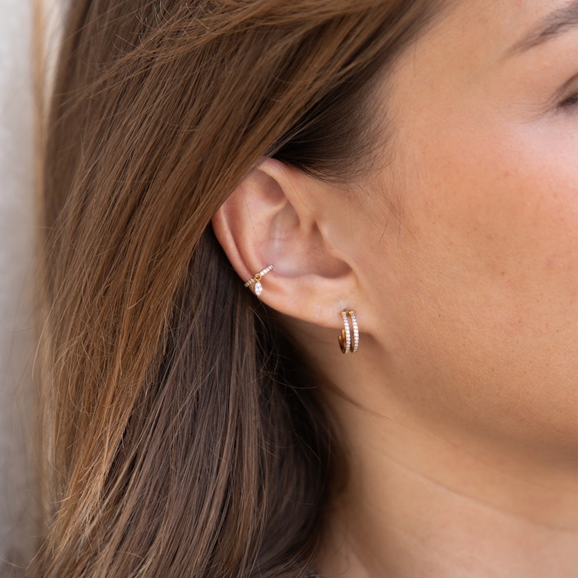 Este precioso aro incluye diminutas piedras circonitas a lo largo de su parte frontal y una circonita más grande en corte marquise que cuelga de forma elegante.