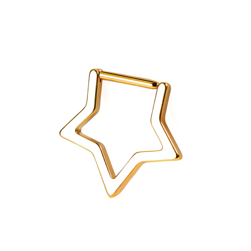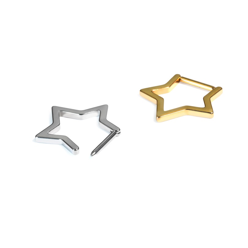 Este aro clicker de titanio en forma de estrella es una joya perfecta para una gran variedad de piercings, entre ellos: septum, helix, para el lóbulo o rook. Gracias al titanio del que está hecho, es waterproof, suave para pieles sensibles y duradero. La bisagra hace que sea sencillo de insertar en el piercing. Es una joya hueca, con solo la silueta de la estrella, lo que permite tener un look más maximalista, pero, a su vez, es muy ligera, por lo que es cómoda de llevar.