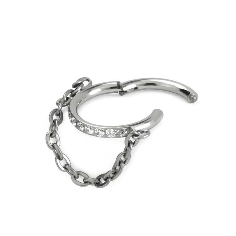 Este aro clicker de titanio está recubierto de delicadas piedras e incluye una cadena colgante. La cadena está adherida a ambos extremos del aro y cuelga con gracia por debajo de este.
