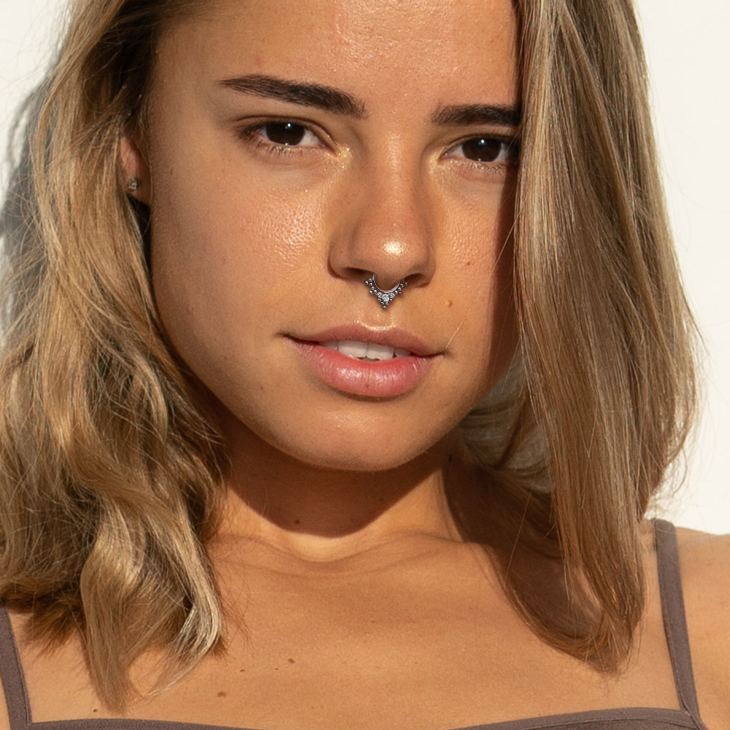 El aro que ves en la imagen no tiene ninguna parte suelta. De esta manera, no se te perderá ninguna pieza cuando te pongas la joya en el piercing. Esto se debe a que la pequeña bisagra conecta el aro con el cierre. El cierre es una parte del aro, muy fácil de abrir y cerrar con un simple clic. Solo tendrás que tirar de la bisagra hacia arriba para abrir el aro y, una vez colocado, presionar la bisagra hasta que haga clic para volver a cerrar el aro. ¿Y dónde debería estar colocado? Eso es decisión tuya. Puedes ponerte el aro en el septum o en varios tipos de piercings, solo depende de ti y de tu anatomía.