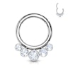 El aro está hecho de titanio, uno de los mejores materiales que puedes elegir para tus piercings; por eso, es el material que suele elegirse para los piercings recién hechos. El grosor de la barra es de 1,2 mm y el diámetro del aro puede ser de 8 mm y 10 mm. En ambas opciones, el aro luce cinco piedras brillantes en la parte inferior. La piedra central es la más grande, y el resto van haciéndose más pequeñas a cada lado.