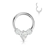 Este aro de acero quirúrgico hará que tu piercing deslumbre como se merece. Gracias a un recubrimiento de PVD duradero, la joya está disponible en varios colores radiantes que duran mucho más que un aro de recubrimiento normal. El aro también viene con un brillante en forma de pera, colocado entre dos brillantes más pequeños de forma redondeada. Los brillantes están colocados mirando hacia el exterior, haciendo que el aro sea perfecto para el septum y para ciertos piercings en la oreja, como el daith o el tragus.