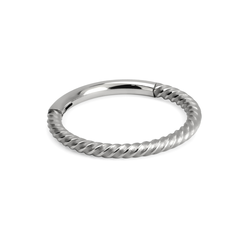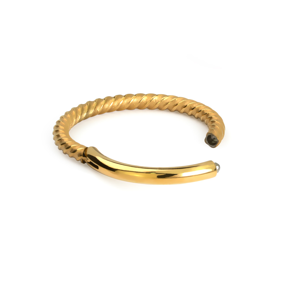 Este es un aro sin fin, en el sentido de que cuando está cerrado, no puedes ver dónde empieza y dónde termina el aro. No tiene bolas ni ninguna otra parte que se pueda soltar. Viene con una bisagra que sujeta un extremo del aro. El otro extremo se puede cerrar con un clic y el aro quedará cerrado en tensión.