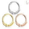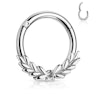 Este es un aro de acero quirúrgico con bisagra, con hojas de laurel que emergen de la parte inferior del aro y se van extendiendo hacia los lados. No se extienden a lo largo del círculo porque sería casi imposible ponerse el aro en ese caso.