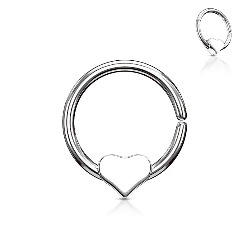 Este aro está compuesto por dos partes separadas hechas en acero quirúrgico. Por una parte está el aro, que tiene una pequeña apertura, y por la otra está el corazón. Al mismo tiempo, el corazón está atravesado por un pequeño agujero, por el que puede pasar el aro. Por supuesto, la ley de la gravedad será la responsable de asegurar que el corazón siempre queda por la parte de abajo.