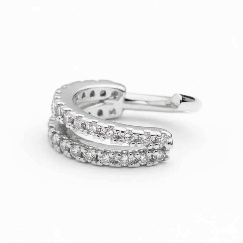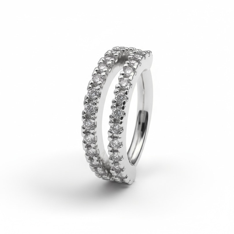 El aro está disponible en tres colores. La única diferencia entre los modelos es el color, ya que la forma, el tamaño, el material y todo lo demás son exactamente iguales independientemente del color que elijas. El aro es de latón y está chapado en platino en el caso del modelo plateado. En el caso de los modelos dorados, están chapados en oro de 14 quilates. El aro tiene un grosor de barra de 1,2 mm y un diámetro de 8 mm. En total, según hemos podido contar, hay 30 brillantes en cada aro.