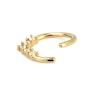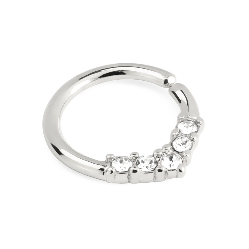 El aro está hecho de latón y recubierto con platino, por ejemplo, si eliges la versión plateada, y de 14 quilates de oro si eliges una de las versiones en oro. La pequeña V en la parte inferior de la joya está cubierta por pequeñas piedras transparentes para darle a la pieza un poco más de brillo.