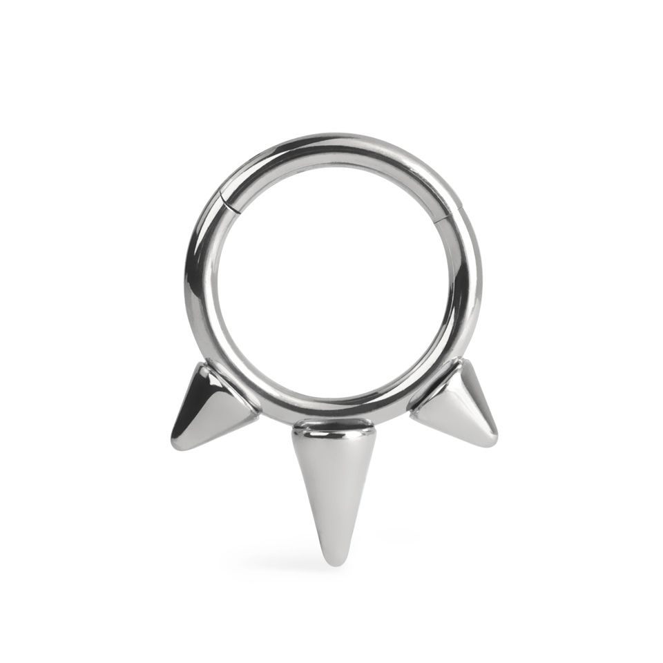 Además de todo lo mencionado, el aro tiene un look extremo, ya que viene con 3 pinchos. El pincho de en medio tiene un tamaño de 5 mm y los de los lados tienen 3,4 mm.