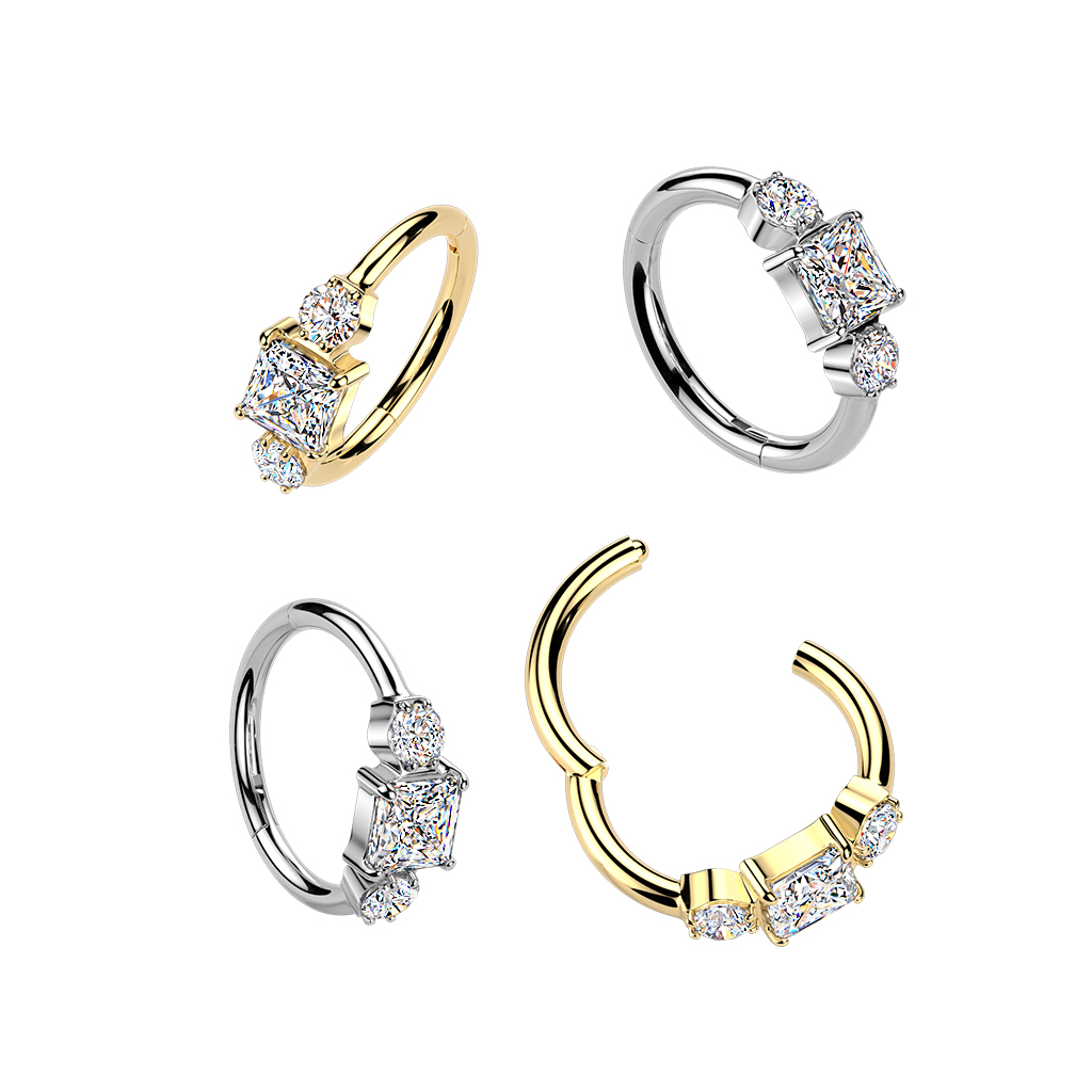 Tres piedras, un estilazo. Este aro de titanio con bisagra y tres piedras de circonita de Bodymum Premium le da a tu piercing ese brillo que necesita. Sutil como para llevarlo en tu día a día, pero lo suficientemente brillante como para girar cuellos allá donde vayas.