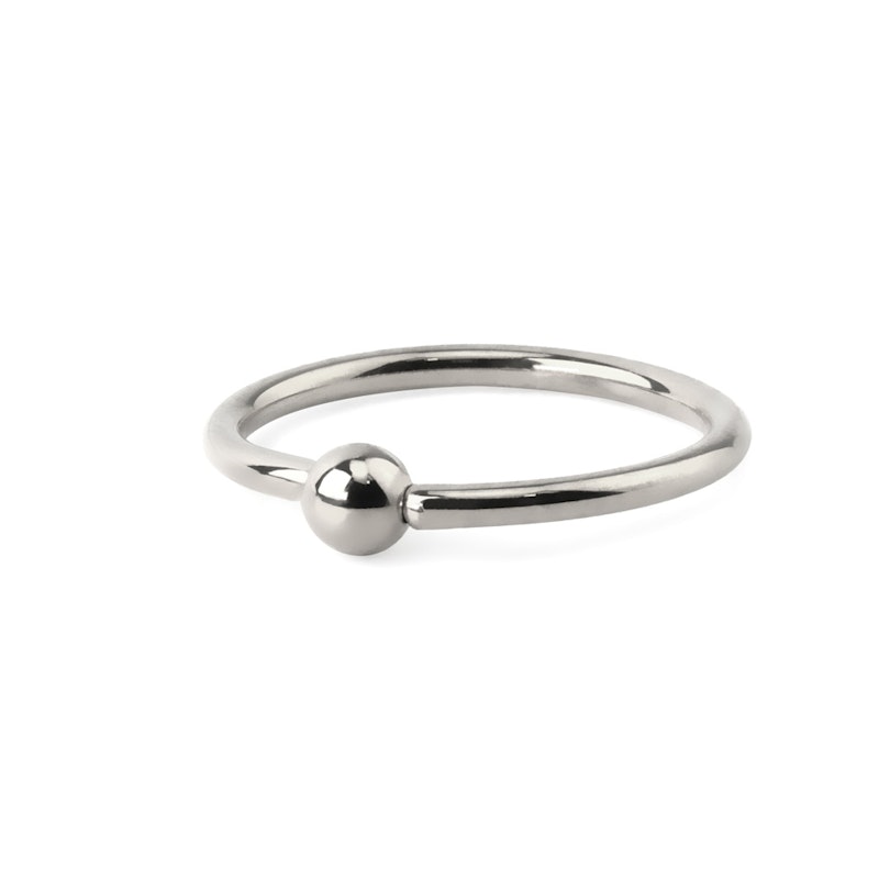 Un aro cautivo normalmente tiene una bola que se usa para cerrar el aro. La bola debe estar en tensión entre los dos extremos del aro. Este sistema tiene ventajas y desventajas, y la mayor desventaja es que la bola se puede perder. Pero eso no pasará con este aro, ya que la bola está fija en uno de los extremos. De este modo, la bola no funciona como cierre, sino que decora el aro dándole el aspecto de una bola cautiva.