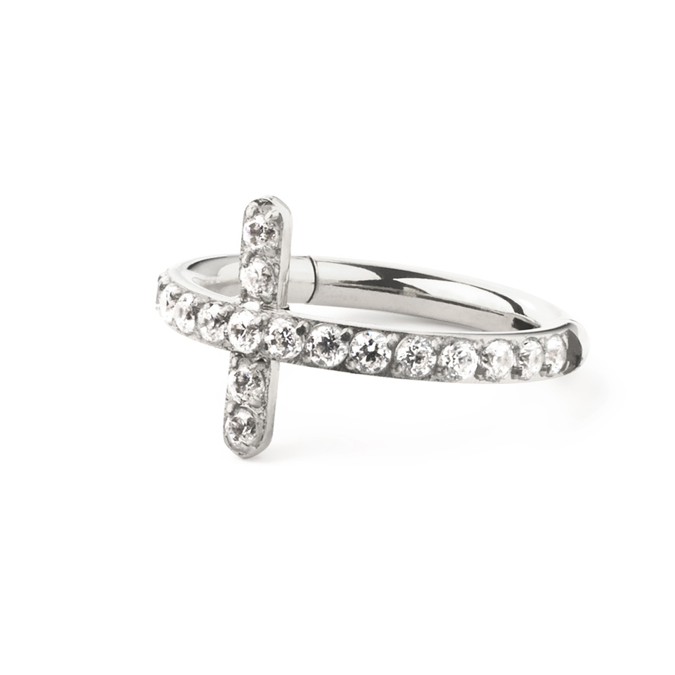 La parte frontal de este estiloso aro de titanio forma una cruz decorada con diminutas piedras brillantes. Con su cierre de bisagra, resulta facilísimo de colocar en tus piercings. El titanio es hipoalergénico y superduradero, así que tu joya no perderá nunca su brillo. Está disponible en acabados oro y plateado, y diámetros de 8 y 10 mm. Un aro de lo más versátil que puedes lucir en multitud de piercings, incluidos el del lóbulo, el helix y el tragus.