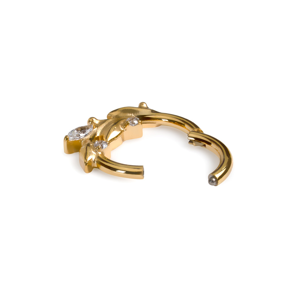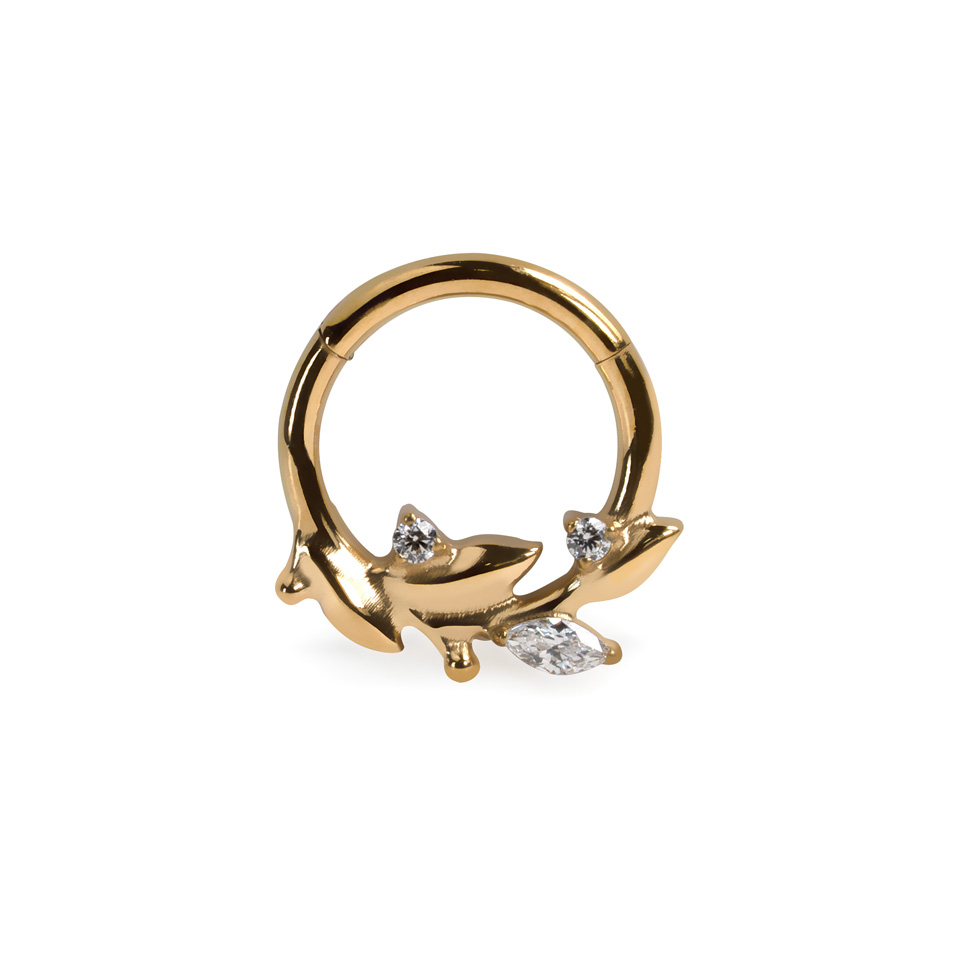 Este precioso aro con hojas delicadas está hecho de titanio, lo cual lo hace perfecto para pieles sensibles. Gracias al mecanismo de bisagra, es muy sencillo asegurar el aro en tu piercing.