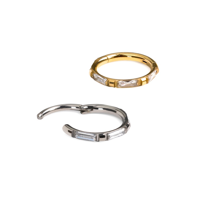 Este aro de titanio con pedrería estilo "corte baguette" tiene un diseño elegante, alternando las piedras rectangulares de circonita cúbica estilo "corte baguette" con pequeños cuadraditos de metal en la parte externa del aro. Como tiene bisagra, es sencillo colocarlo y asegurarlo en tu piercing, y, al estar hecho de titanio, esta joya es hipoalergénica, duradera y waterproof.