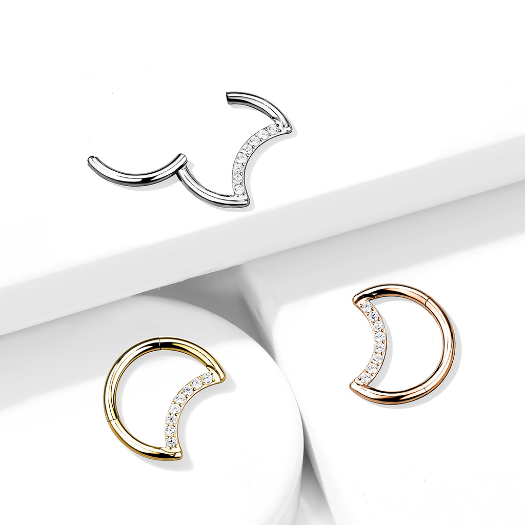 Este aro tiene características de las joyas lujosas, ya que el titanio es un material bastante caro. También cuenta con bisagra, algo que se suele encontrar en la joyería más costosa. Además, los brillantes que ves en la medialuna están colocados con mucha precisión, obviando el hecho de que están en forma de arco.