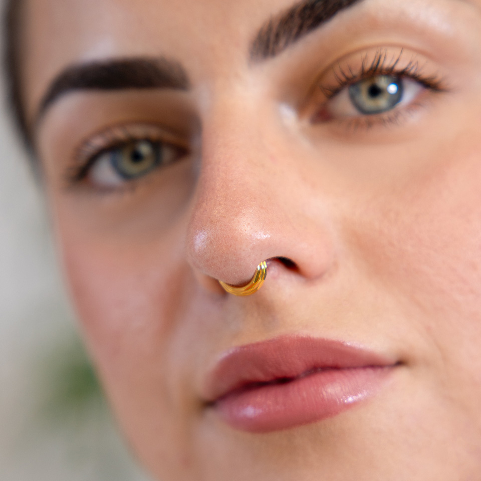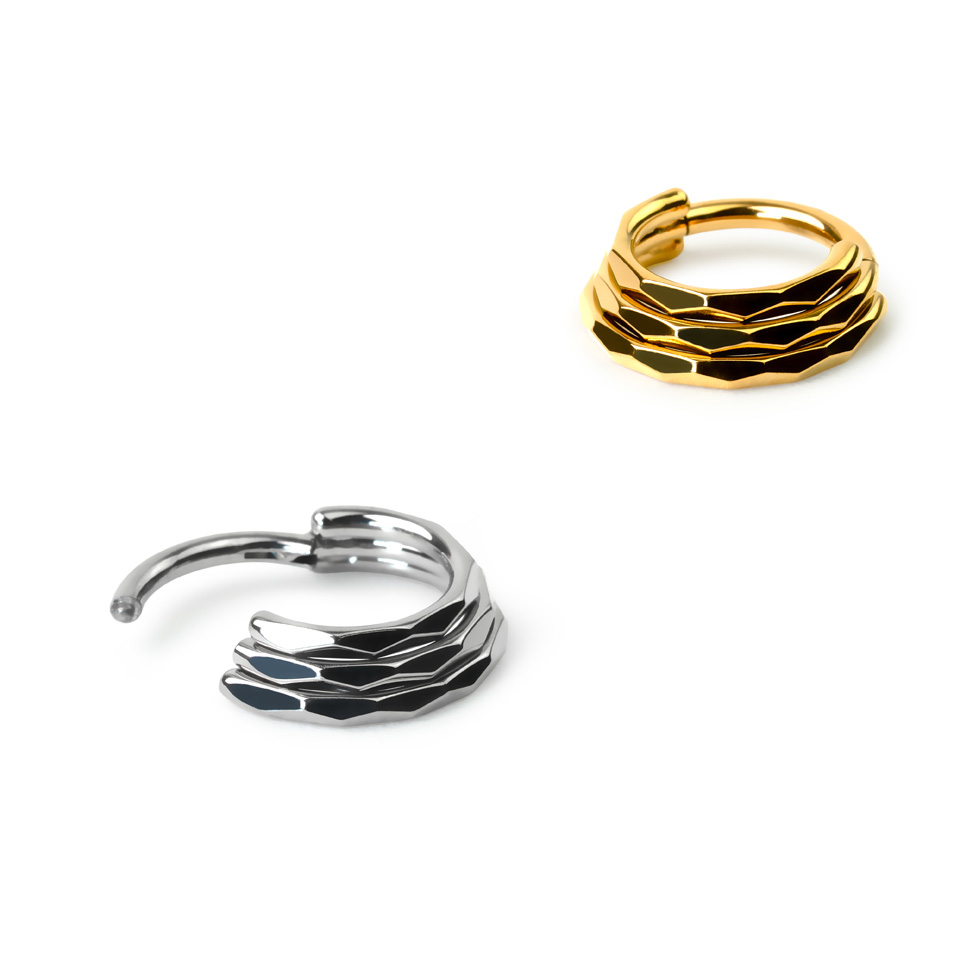 Este estiloso aro clicker hace el efecto de 3 aros en uno, mientras que solo el del medio atraviesa realmente tu piercing. La cara externa de los aros incluye un relieve en forma de diamante, lo que le da una textura muy sofisticada.