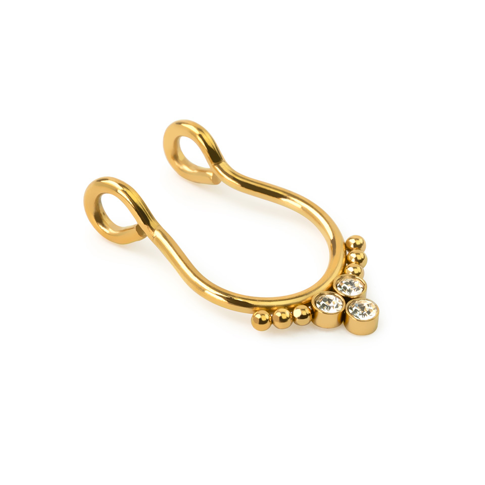 Las joyas clip-on son perfectas para realzar tu estilo al instante. Un aro falso para el septum queda ajustado a tu nariz como si fuera de verdad. ¿Quién va a notar la diferencia? Y esta joya no solo es preciosa, sino que además está hecha de acero quirúrgico 316L, un material para piercings muy seguro y de alta calidad.