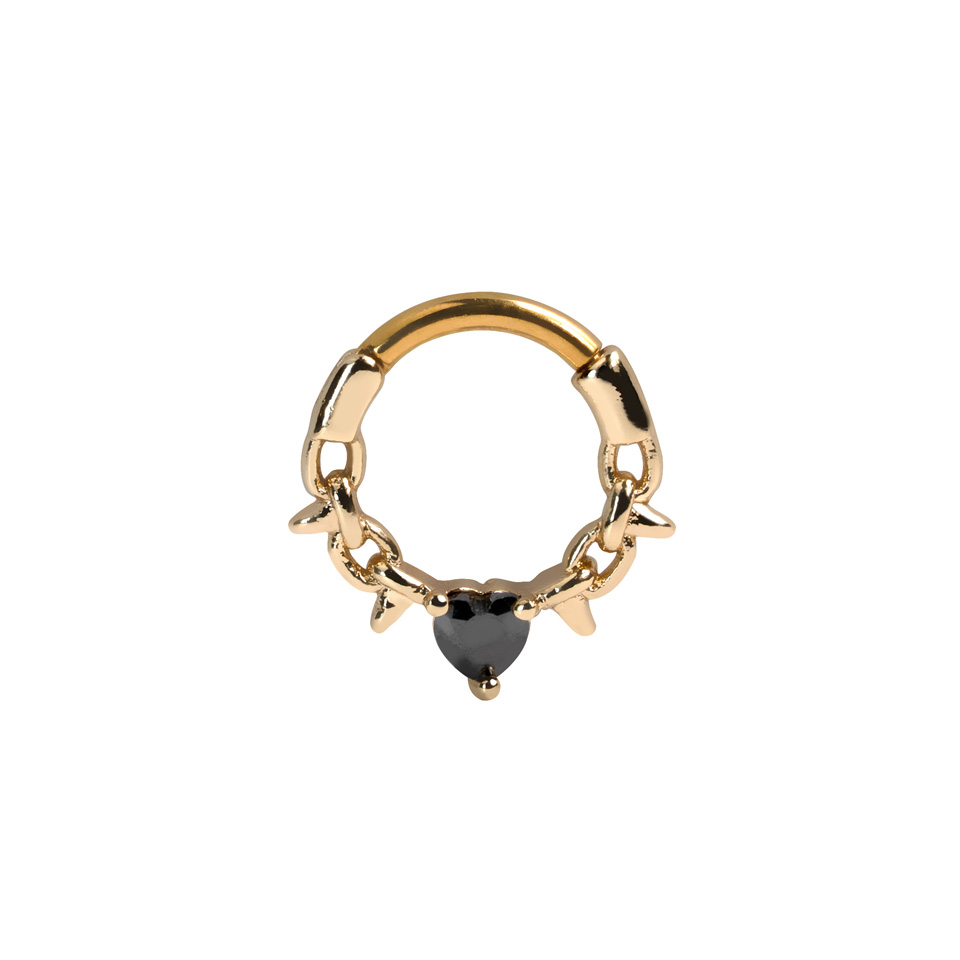 Este aro frontal luce un diseño de alambre de espino con una gema en el centro en forma de corazón. Gracias a su bisagra, se puede asegurar de manera sencilla en el piercing.