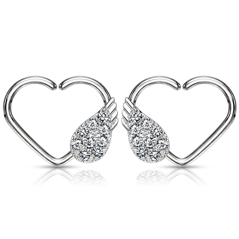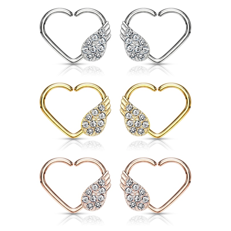Un lado del corazón tiene una pequeña ala de ángel, recubierta con pequeños brillantes de color claro. Si eliges el piercing para la oreja derecha, el ala estará en la parte derecha, y viceversa. Esto significa que no podrás usar el piercing en ambas orejas. Bueno, sí que puedes, pero el ala estará hacia atrás y no es lo que queremos. Las medidas internas de este corazón son de 11 mm de ancho por 8 mm de alto. El corazón y el ala tienen un revestimiento de platino en el modelo de color plateado, y los modelos de color dorado están chapados en oro de 14 quilates.