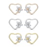 La joya está hecha de una pieza de latón que toma la forma de un corazón y tiene una pequeña abertura en la parte superior, por lo que puede colocarse fácilmente en la oreja. Las medidas internas de este corazón son de 8 mm de ancho por 8 mm de alto. El corazón ha sido recubierto con oro de 14 quilates en sus versiones de color oro. Puedes elegir el color que desees entre las opciones de más arriba. Aunque puedes elegir el color del corazón, las piedras de la flor siempre serán transparentes.
