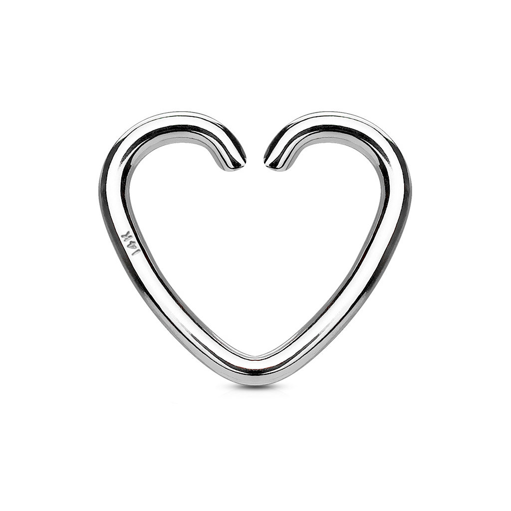 Puedes comprar este corazón en diferentes versiones, entre las que podrás elegir el tipo de oro, así como el grosor que mejor se ajuste a tu piercing. Las medidas internas de este corazón son de 10 mm de ancho por 9 mm de alto. Todos los modelos son del mismo tamaño, excepto por el grosor de la barra. Podrás llevar esta joya en la mayoría de los piercings en la oreja, pero probablemente sean el trago, la hélice y el daith los mejores piercings.