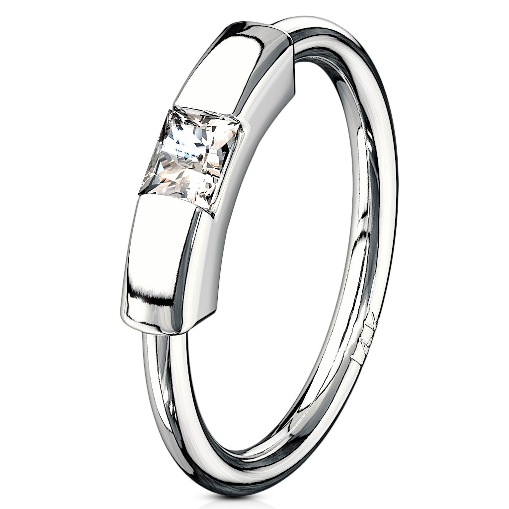 Precioso y elegante aro segmentado, hecho en oro puro de 14 quilates. Es perfecto para ti si eres una persona muy exigente con las joyas que llevas. Se puede decir que la calidad de este aro es ilimitada y su diseño atemporal, ya que tan solo está decorado con un bonito brillante rectangular.