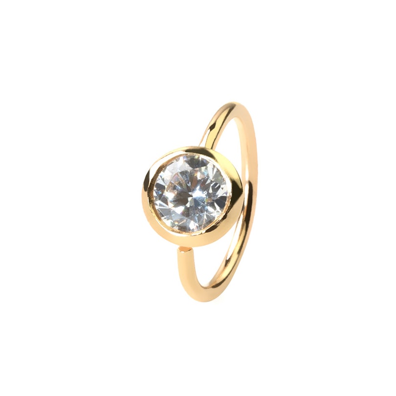 Te presentamos una original y simple argolla hecha en oro de 14 quilates, para ti, que te gustan las joyas de buena calidad. Este aro tiene un grosor de barra de 0,8 mm y su diámetro mide 8 mm. Su bola está decorada con un brillante de color blanco, que queda sujeto por media bola cóncava, unida a la estructura de la joya. La bola se ajusta al extremo del aro para poderlo cerrar, por lo que no debes de temer que se pueda perder. Tan sólo tendrás que abrir tu aro con un pequeño giro e introducirlo en tu perforación, para después ajustar el extremo a la bola. Es tan simple como rápido.