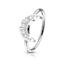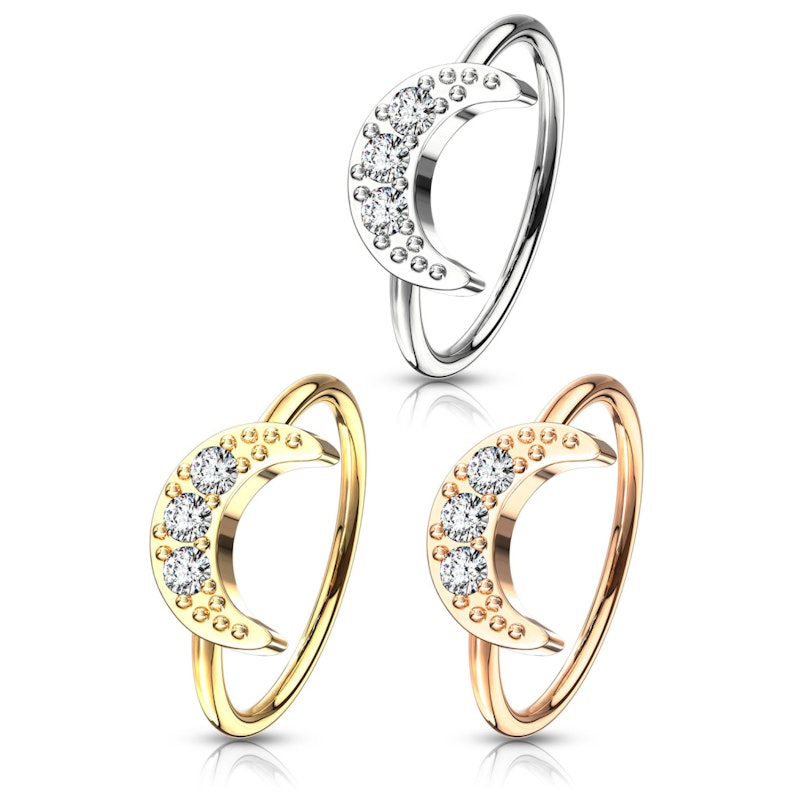 Aro sin fin en acero quirúrgico con diseño de luna creciente. La luna está decorada con tres piedras brillantes transparentes en el centro y recubierto de diminutas bolitas.
