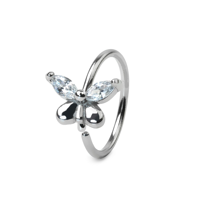 Este encantador aro luce una bonita mariposa cuyas alas superiores están compuestas por piedras brillantes.