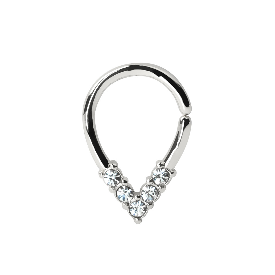 Este aro sin fin en forma de lágrima luce 5 delicadas piedras transparentes que decoran la parte frontal. Al estar hecha de acero quirúrgico, es una joya de lo más resistente que no pierde su brillo. Está disponible en grosores de barra de 1 y 1,2 mm, por lo que puedes llevarlo en una amplia gama de piercings, entre ellos el septum, el tragus, el helix y más.