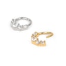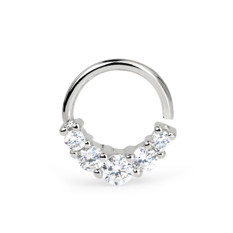 El tipo de aro que ves aquí es un aro sin fin. Lo cual no significa literalmente que no tenga fin, sino que sus extremos no son apreciables cuando el aro está cerrado. Puedes abrir y cerrar esta joya girando sus extremos en direcciones opuestas. Cuando la hayas colocado en tu piercing, presiona los extremos en sentido opuesto para cerrarla.