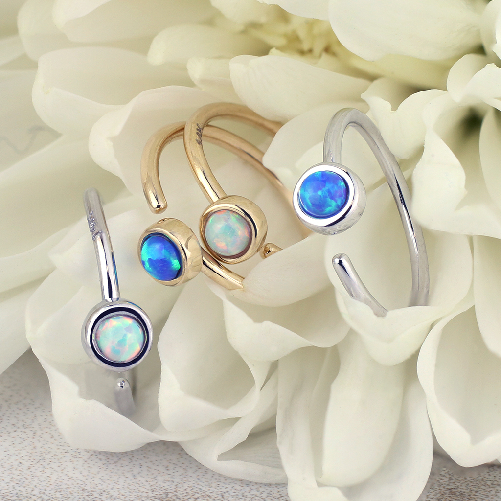 Además de elegir entre el tipo de oro de esta joya, también puedes elegir el color del ópalo: blanco o azul. El de color blanco tiene tonos rojizos, amarillos y verdes, pero el tono predominante es el blanco. Asimismo, el ópalo azul tiene tonos azul claro, turquesa y azul oscuro.