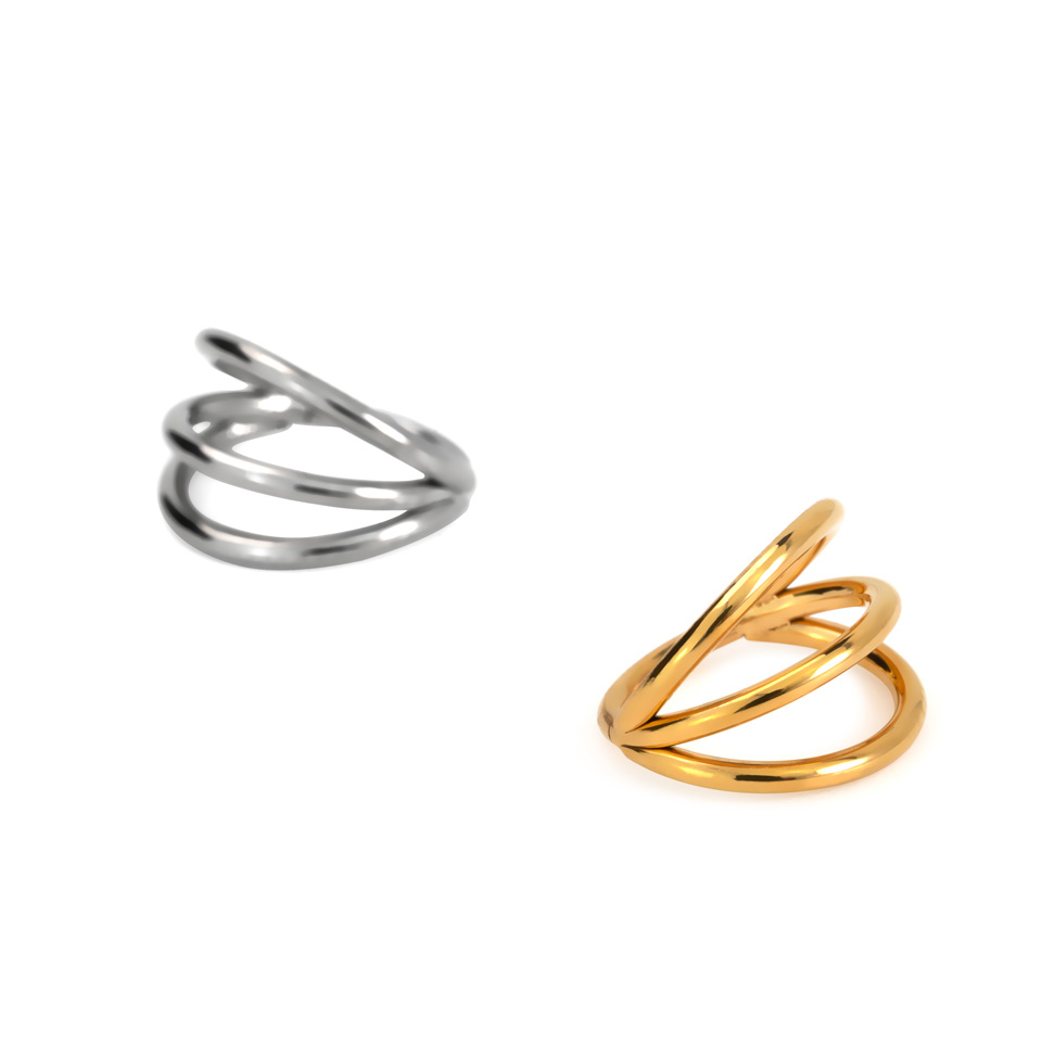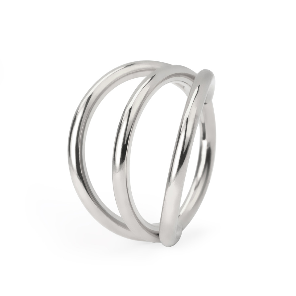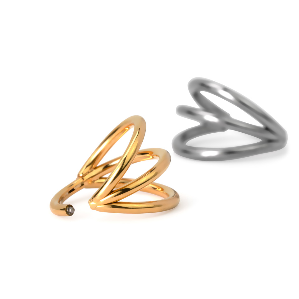 Este aro sencillo pero efectivo incluye tres aros separados, que se fusionan a los extremos en uno solo para atravesar tu piercing.