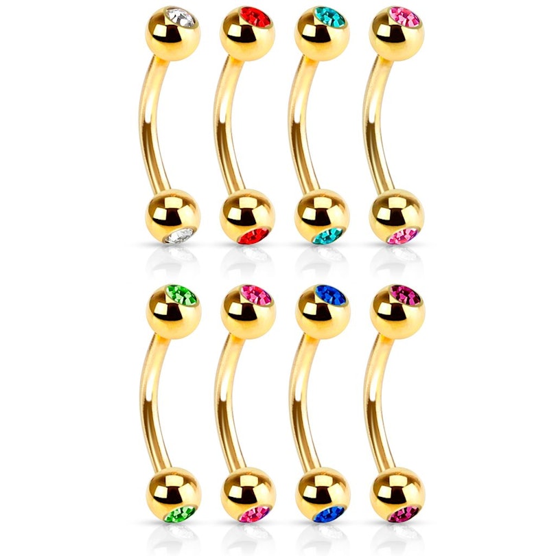 Esta joya está hecha en acero quirúrgico y posteriormente ha sido chapada en oro. Tiene un brillante en cada una de sus bolas. Se trata de una joya especialmente indicada para el piercing en la ceja, pero también la podrás llevar en tu piercing en el pezón y en tu piercing íntimo.