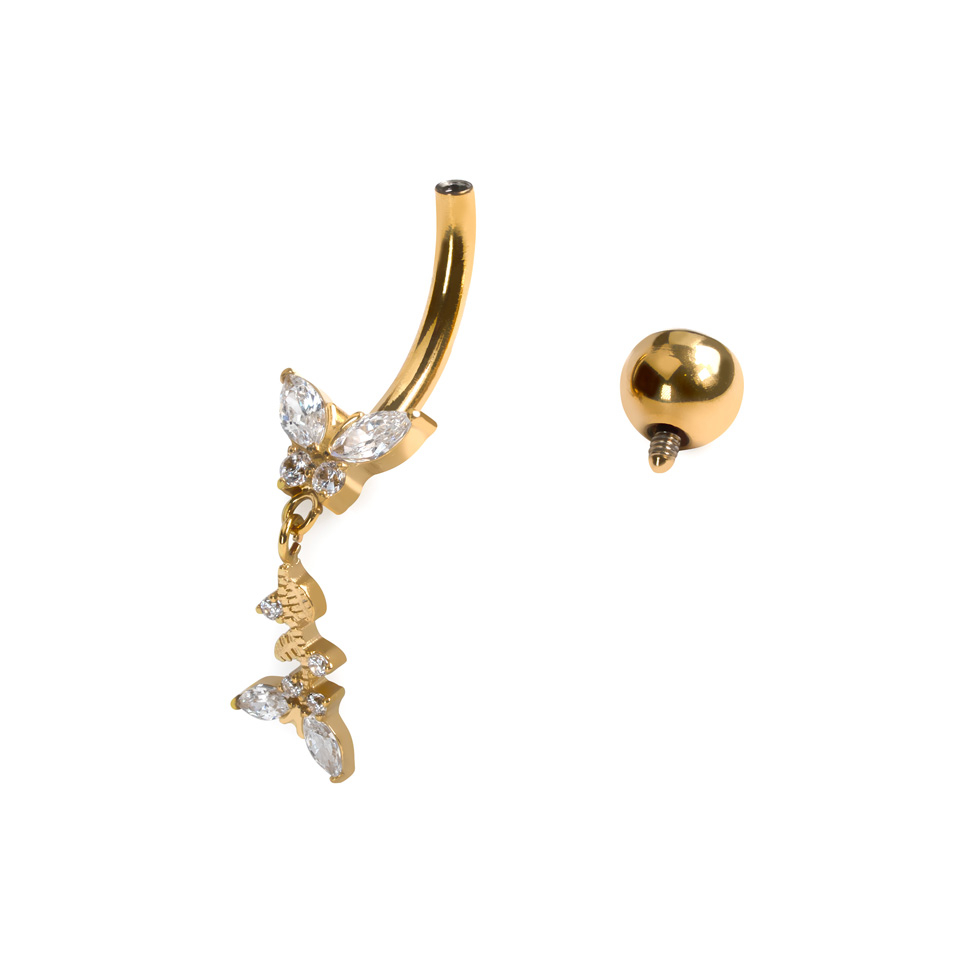 Esta preciosa barra de titanio para el ombligo con mariposas incluye una mariposa central con un colgante con pedrería que simulan hojas al caer. Como está hecha de titanio, es waterproof y apta para pieles sensibles.