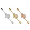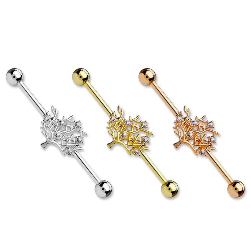La barra de esta joya está hecha en acero quirúrgico y está disponible en tres colores. La única diferencia entre estos modelos es el color, ya que la forma y los brillantes son iguales sea cual sea el color que elijas. El árbol está hecho en latón, al que se le ha aplicado posteriormente un revestimiento de distintos colores.