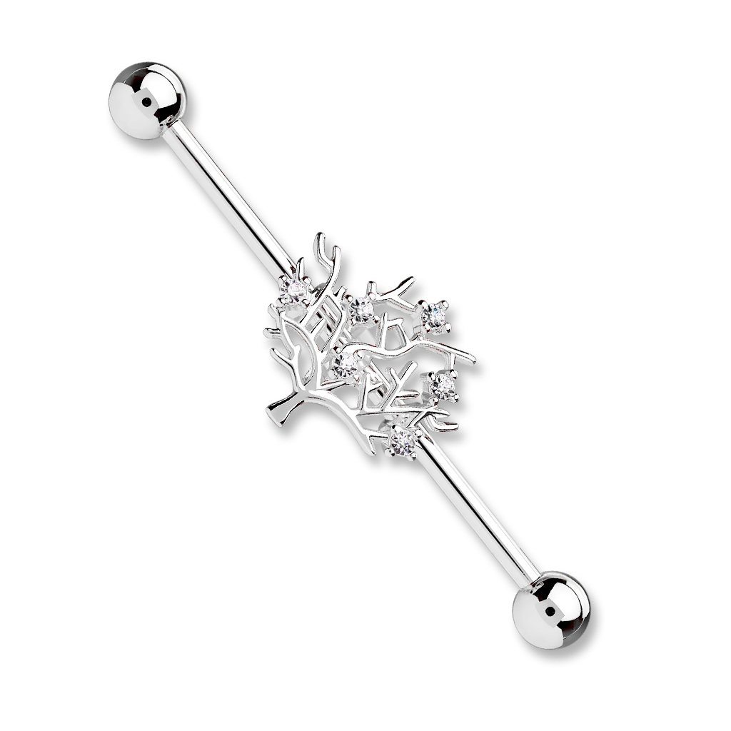 La barra de esta joya está hecha en acero quirúrgico y está disponible en tres colores. La única diferencia entre estos modelos es el color, ya que la forma y los brillantes son iguales sea cual sea el color que elijas. El árbol está hecho en latón, al que se le ha aplicado posteriormente un revestimiento de distintos colores.