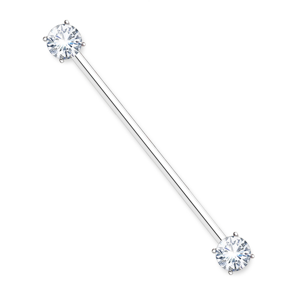 En la fotografía superior te mostramos una de las barras industriales que verás jamás. La barra de esta joya está hecha de acero quirúrgico, y en cada uno de sus extremos encontramos una preciosa circonita. Las circonitas están dispuestas en un semicírculo de acero que pertenece a la estructura de la joya, del mismo color de la barra. De ellas nacen cuatro pequeñas garras que garantizan que las circonitas permanezcan siempre en su lugar.