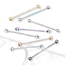 Si tienes un piercing industrial en la oreja, tenemos una bonita joya para ti. Consiste en una barra recta de dos bolitas, una en cada extremo. En medio de la barra hay una parte lisa con 8 pequeñas piedritas brillantes colocadas con una precisión milimétrica. La barra es de acero quirúrgico y está disponible en varios colores, así como con brillantes de varios colores. No obstante, solo el modelo de color plata está disponible con piedritas de colores diferentes. En otras palabras, las barras de colores solo están disponibles con piedritas transparentes.