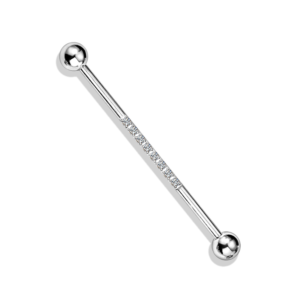 Si tienes un piercing industrial en la oreja, tenemos una bonita joya para ti. Consiste en una barra recta de dos bolitas, una en cada extremo. En medio de la barra hay una parte lisa con 8 pequeñas piedritas brillantes colocadas con una precisión milimétrica. La barra es de acero quirúrgico y está disponible en varios colores, así como con brillantes de varios colores. No obstante, solo el modelo de color plata está disponible con piedritas de colores diferentes. En otras palabras, las barras de colores solo están disponibles con piedritas transparentes.
