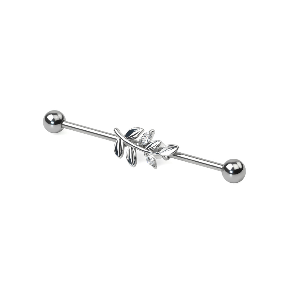 Las flores y las hojas siempre han ido mano a mano con la joyería, y esta barra industrial no es una excepción. En la mitad de la barra se encuentra una rama con hojas que se puede mover. Dos de las hojas han sido reemplazadas por brillantes claros, que añaden a la joya un toque precioso. La rama se puede fijar donde quieras usando los dos O-rings incluidos.