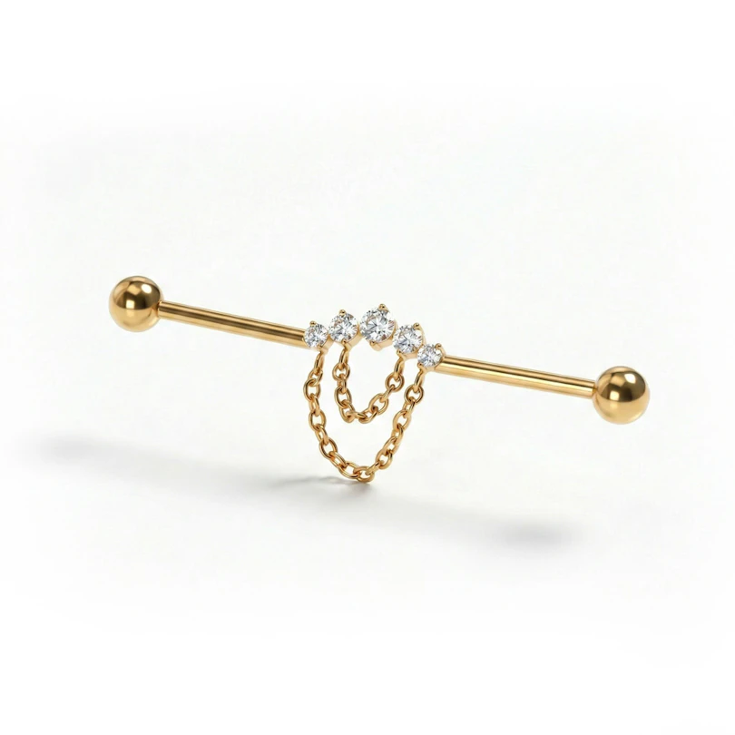 La barra industrial de titanio con pedrería y cadenas añade un extra de detalle a la clásica forma industrial. Pequeñas piedras se colocan a lo largo de la barra con finas cadenas que las conectan para un look en capas, pero comedido y fácil de llevar. Llama la atención sin ser estridente y funciona genial si te va el variar sutilmente tu estilo. Disponible en colores dorado y plateado.