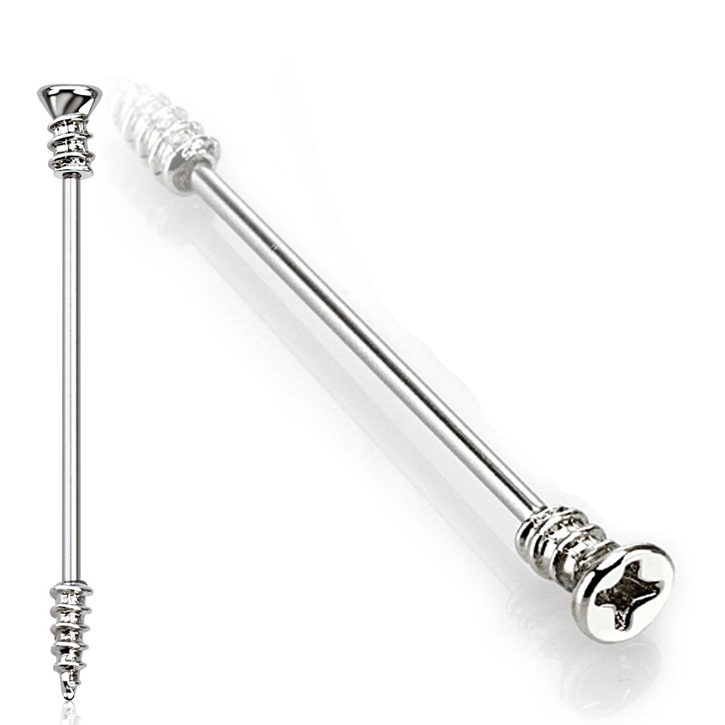 Esta joya es un poco más punk que las demás, y muy original en su diseño. La barra es completamente simple y se coloca entre las dos perforaciones, pero las dos piezas que se ajustan a ella tienen, en cada extremo, la punta y la cabeza de un tornillo.