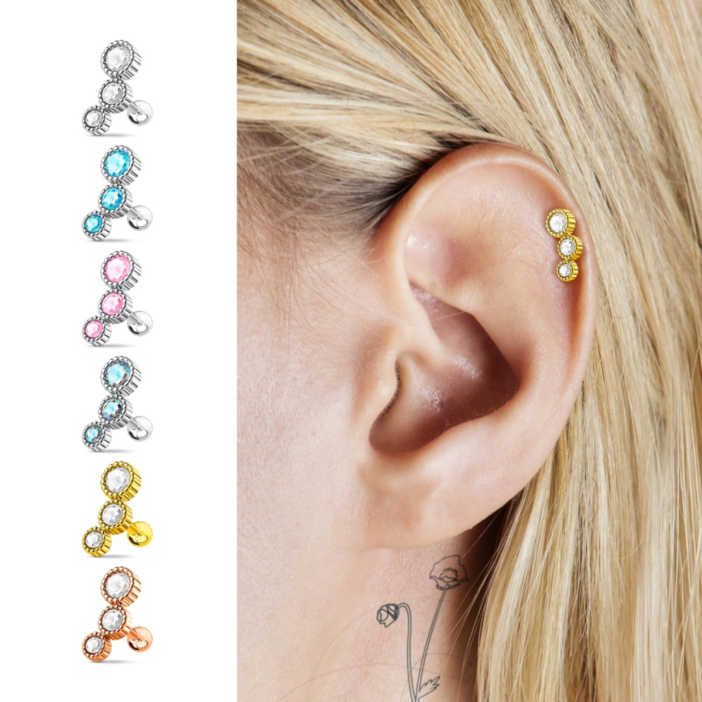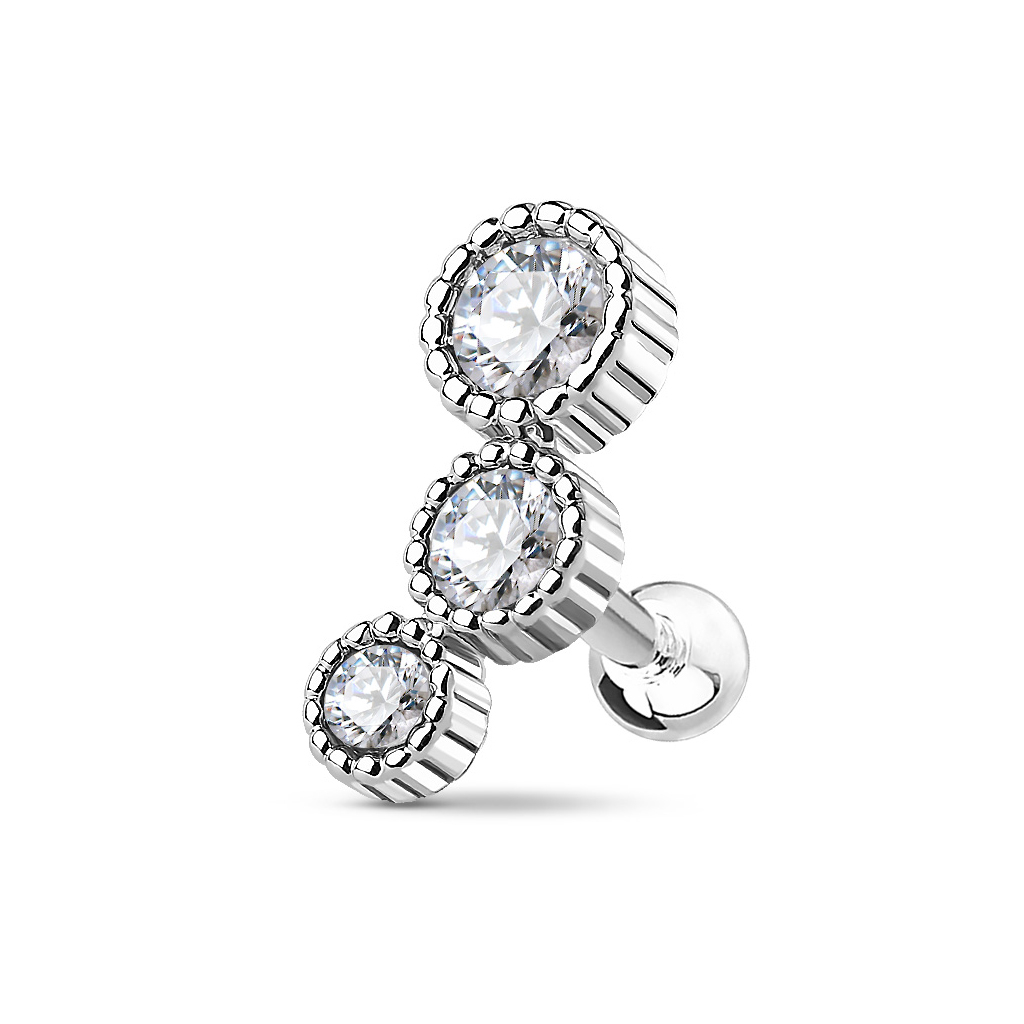 La joya luce tres piedras brillantes de diferentes tamaños en escala, cada una rodeada de pequeños círculos con bolitas que las enmarcan. Las piedras están talladas en corte de diamante, de modo que reflejan la luz desde distintos ángulos y hacen que tu piercing destaque de una forma especial.