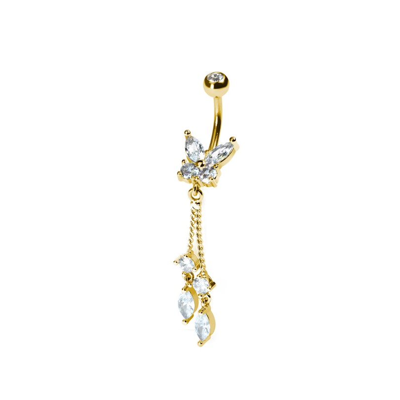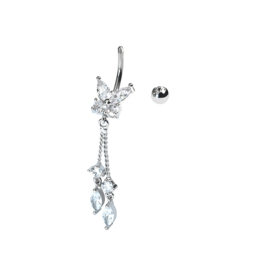 Esta barra para el ombligo luce una preciosa mariposa en la bola inferior, de la que cuelgan dos delicadas cadenas adornadas con dijes de piedras brillantes.