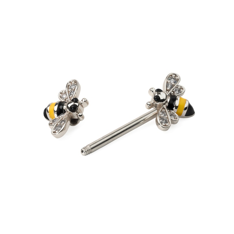 Tenemos una propuesta preciosa para las personas que buscan diseños únicos para sus piercings en el pezón. Esta joya consiste en una barra recta de 14 mm, pero la longitud puede variar, dependiendo de la distancia que dejes entre las abejas.